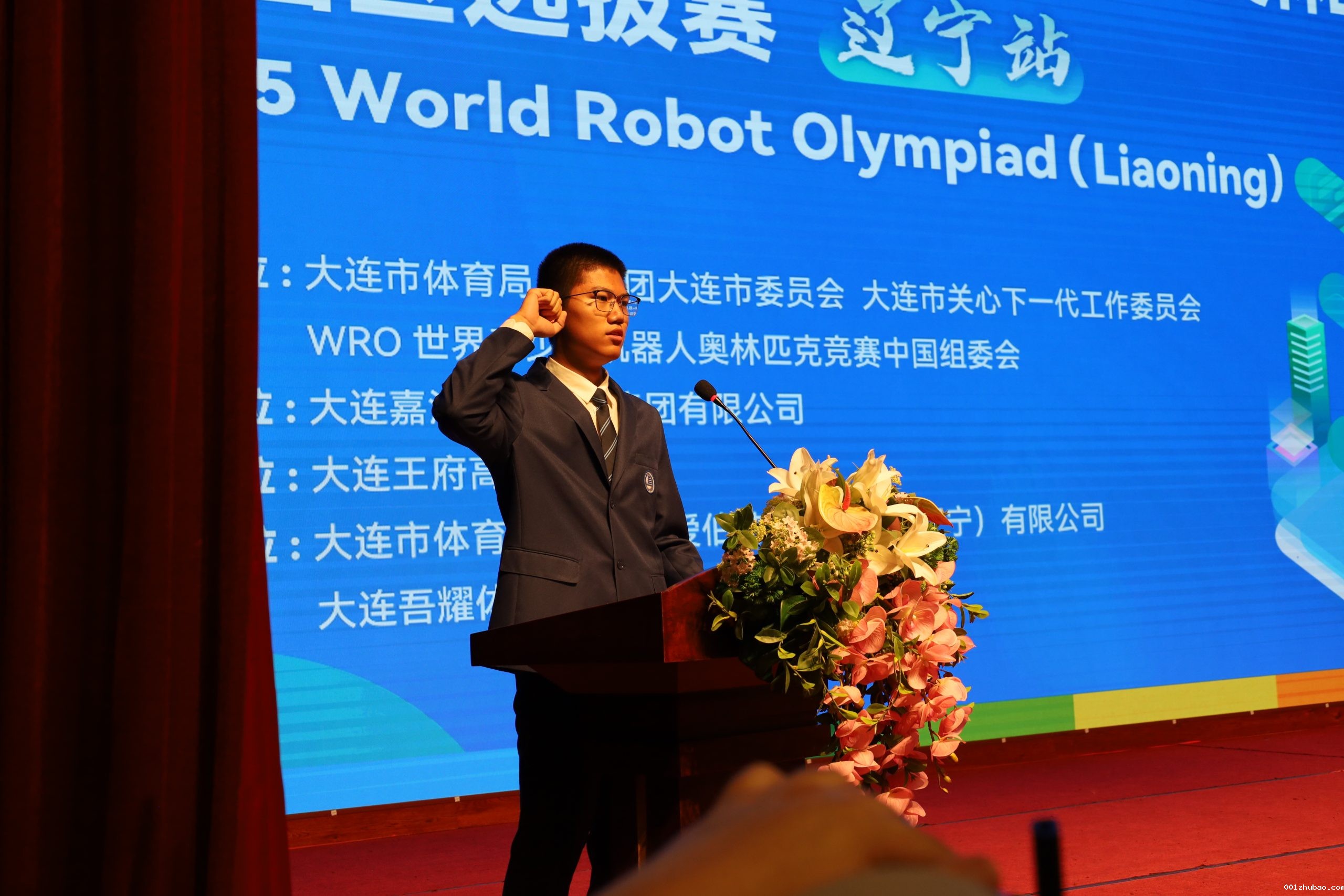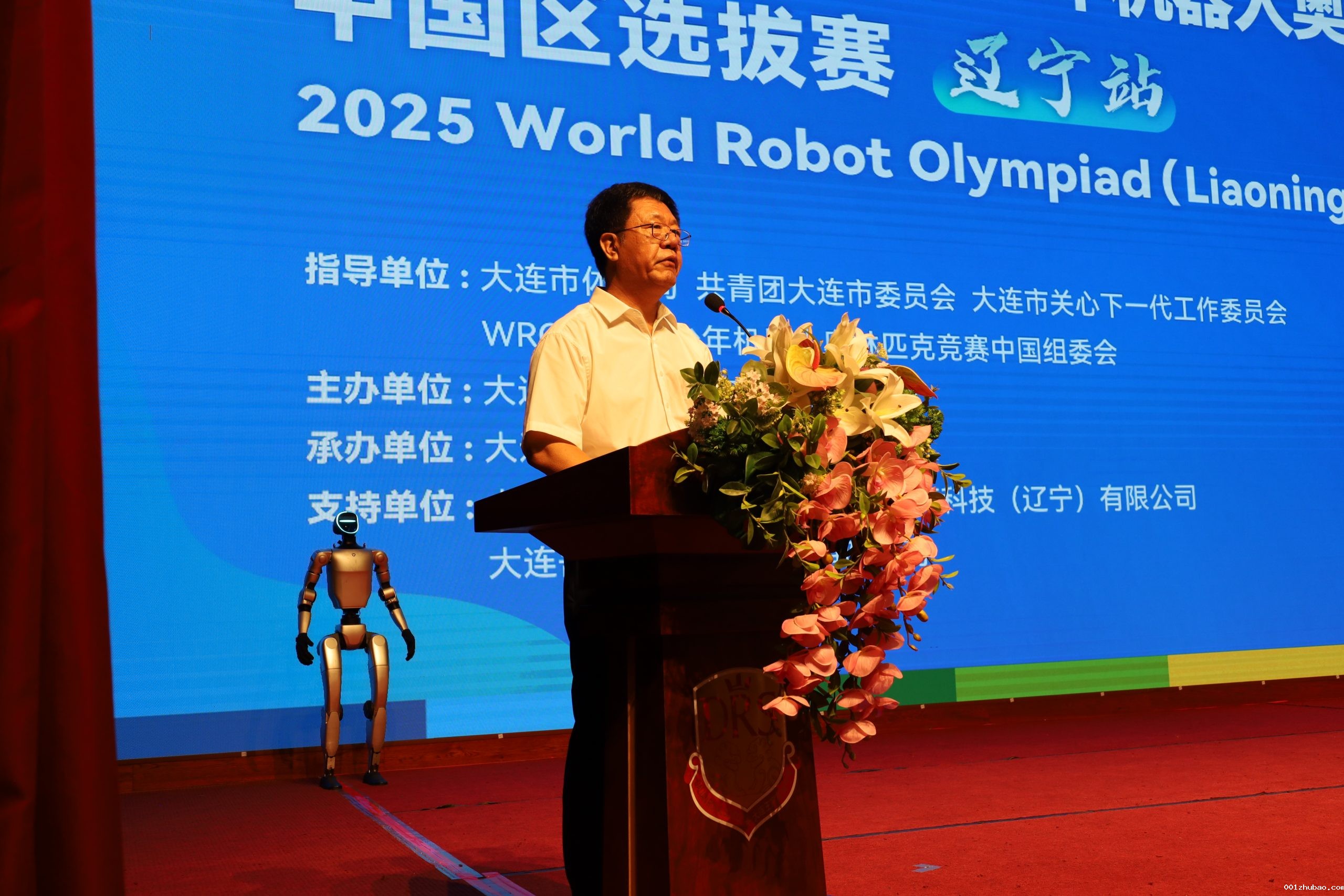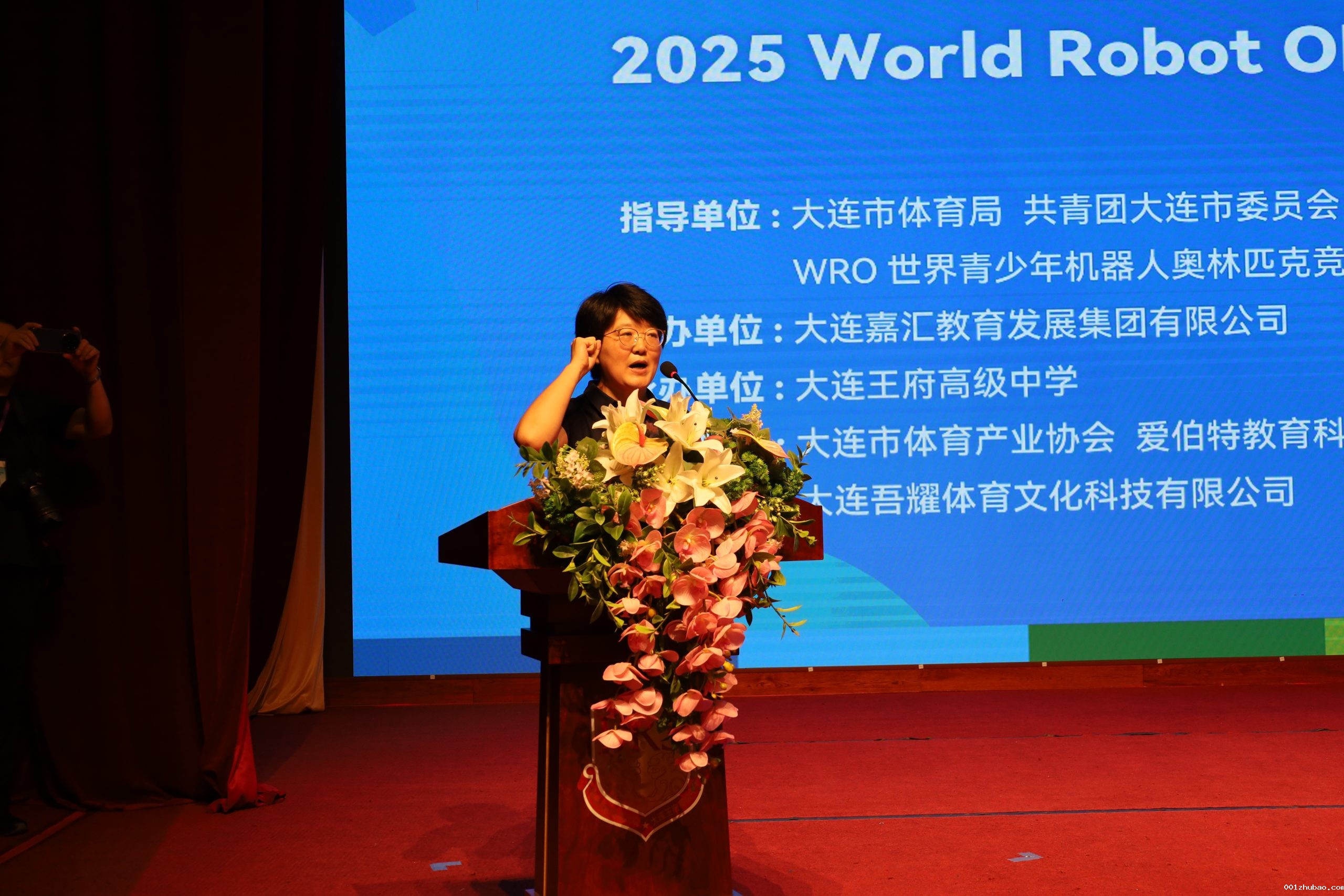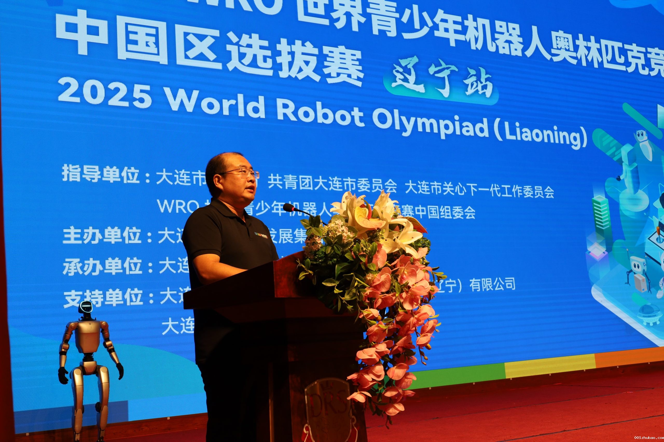WRO 中国区组委会副秘书长周伟先生进行致辞,他介绍了 WRO 赛事的全球影响力,肯定其在激发青少年创新潜能、培养团队协作精神方面的作用,并对大连王府高级中学的赛事筹备工作表示认可。他提到,辽宁选拔赛以培育具有科学潜质的青少年为使命,致力于普及人工智能知识、启迪科学素养、引导科技报国;同时寄语选手珍惜机会,展现才华、弘扬团队精神,预祝赛事成功、选手出彩。